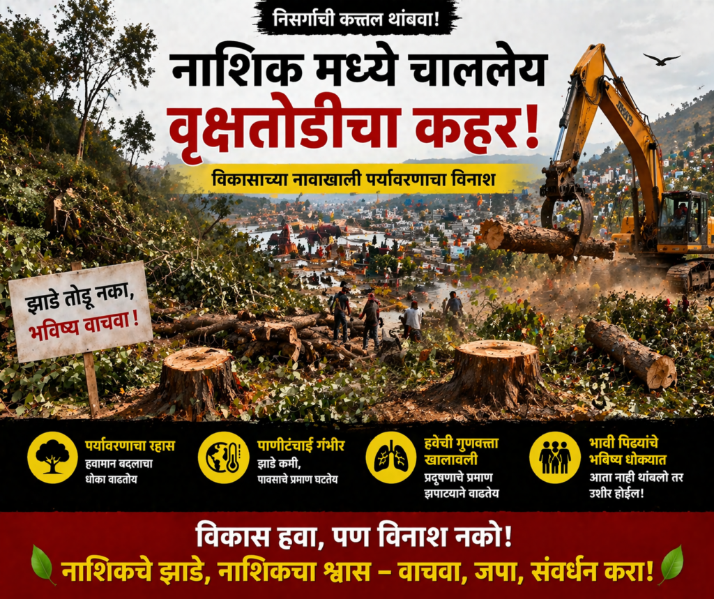 नाशिकच्या तपोवन, पंचवटी आणि मखमलाबाद यांसारख्या भागांत, जिथे दाट झाडी होती, तिथे आता केवळ सिमेंटचे रस्ते दिसत आहेत. इथे वटवृक्ष, पिंपळ आणि कडुनिंबाची झाडे होती जी ५०-१०० वर्षांपासून सावली देत होती, ती काही तासांत जमीनदोस्त केली जात आहेत. कुंभमेळ्याच्या तयारीसाठी तपोवनमध्ये ५४ एकर जमिनीवर साधुग्रामसाठी १७००-१८०० झाडे तोडण्याचे नियोजित आहे. गंगापूर रोडवरही ३००-५०० वर्षे जुनी झाडे कापली गेल्याने स्थानिकांनी विरोध केला आहे. राष्ट्रीय हरित लवादाने (NGT) वृक्षतोडीवर तात्पुरती मनाई केली आहे आणि २८ एप्रिल रोजी पुढील सुनावणी होणार आहे. तरीही काही ठिकाणी काम सुरू असल्याच्या तक्रारीनंतर याचिकाकर्त्यांनी पालिका आयुक्तांना नोटीस बजावली आहे.