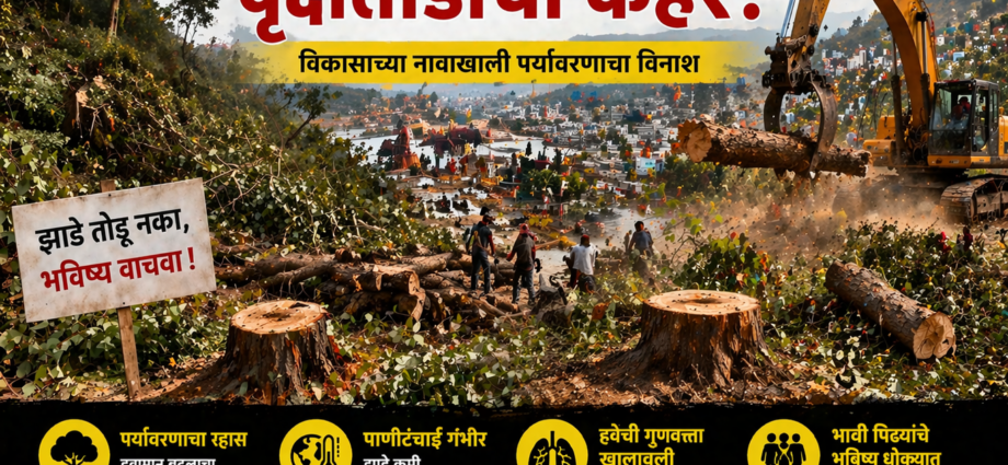 नाशिकमध्ये २०२७ च्या सिंहस्थ कुंभमेळ्याच्या तयारीसाठी तपोवन आणि गंगापूर रोड परिसरात १८०० हून अधिक झाडांची कत्तल सुरू असल्याने पर्यावरणप्रेमींनी संताप व्यक्त केला आहे. रस्ता रुंदीकरण आणि साधुग्राम उभारणीसाठी शतकाहून जुनी झाडे तोडली जात असून, राष्ट्रीय हरित लवादाने (NGT) स्थगिती दिलेली असतानाही काम सुरू असल्याचा आरोप आहे.